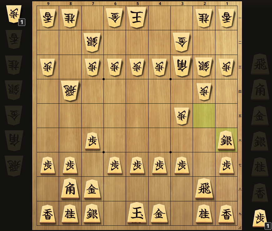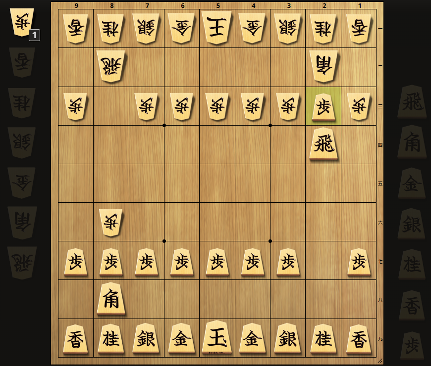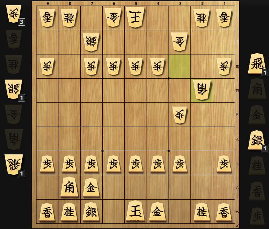 因此圖3後手☖8六步的時候先手選擇☗2三步(圖5),比對手快一步吃掉對方的角行。